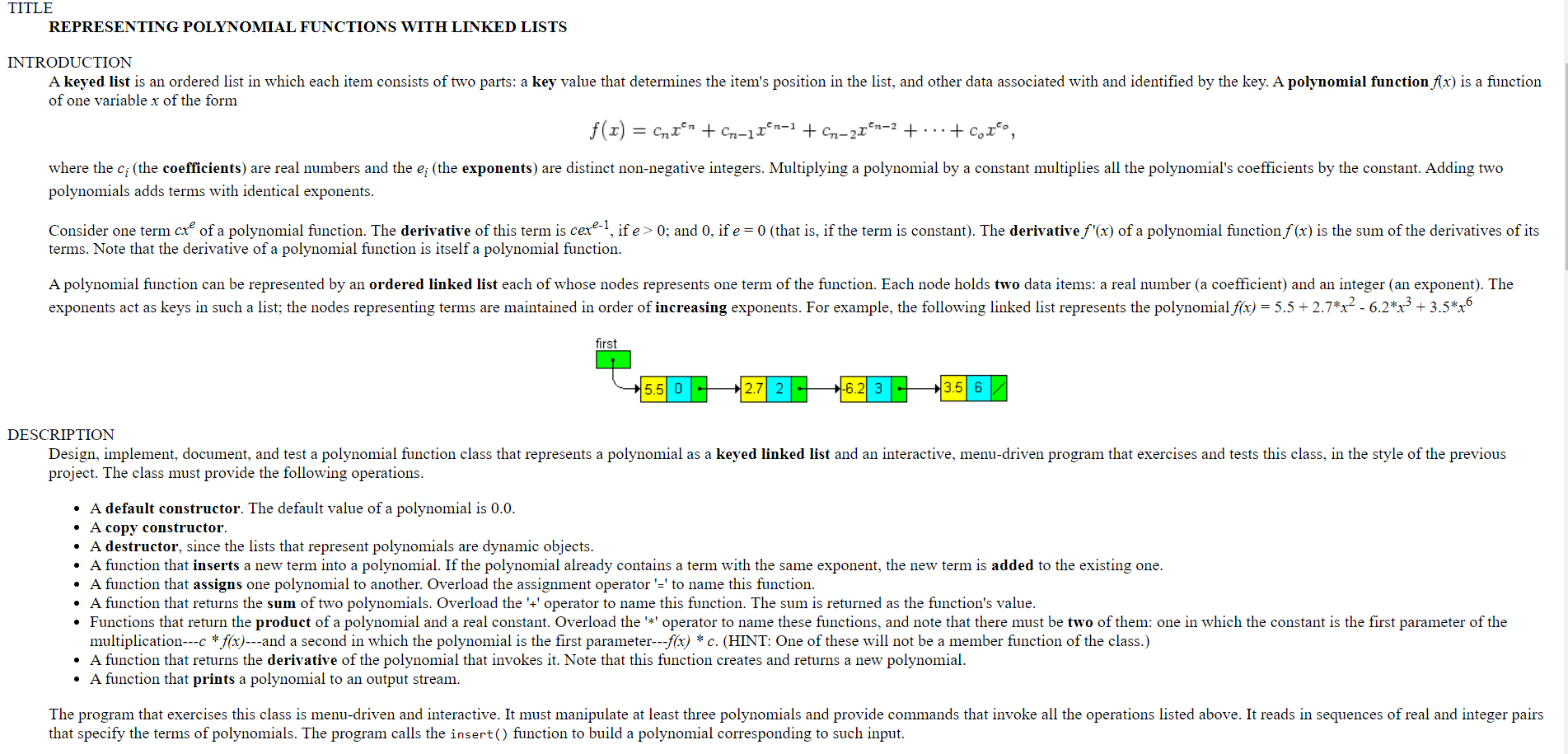 Zero polynomial will consist of one term with coefficient 0 and exponent -1. You will create the implementation of a Polynomial data type. This problem has been solved.